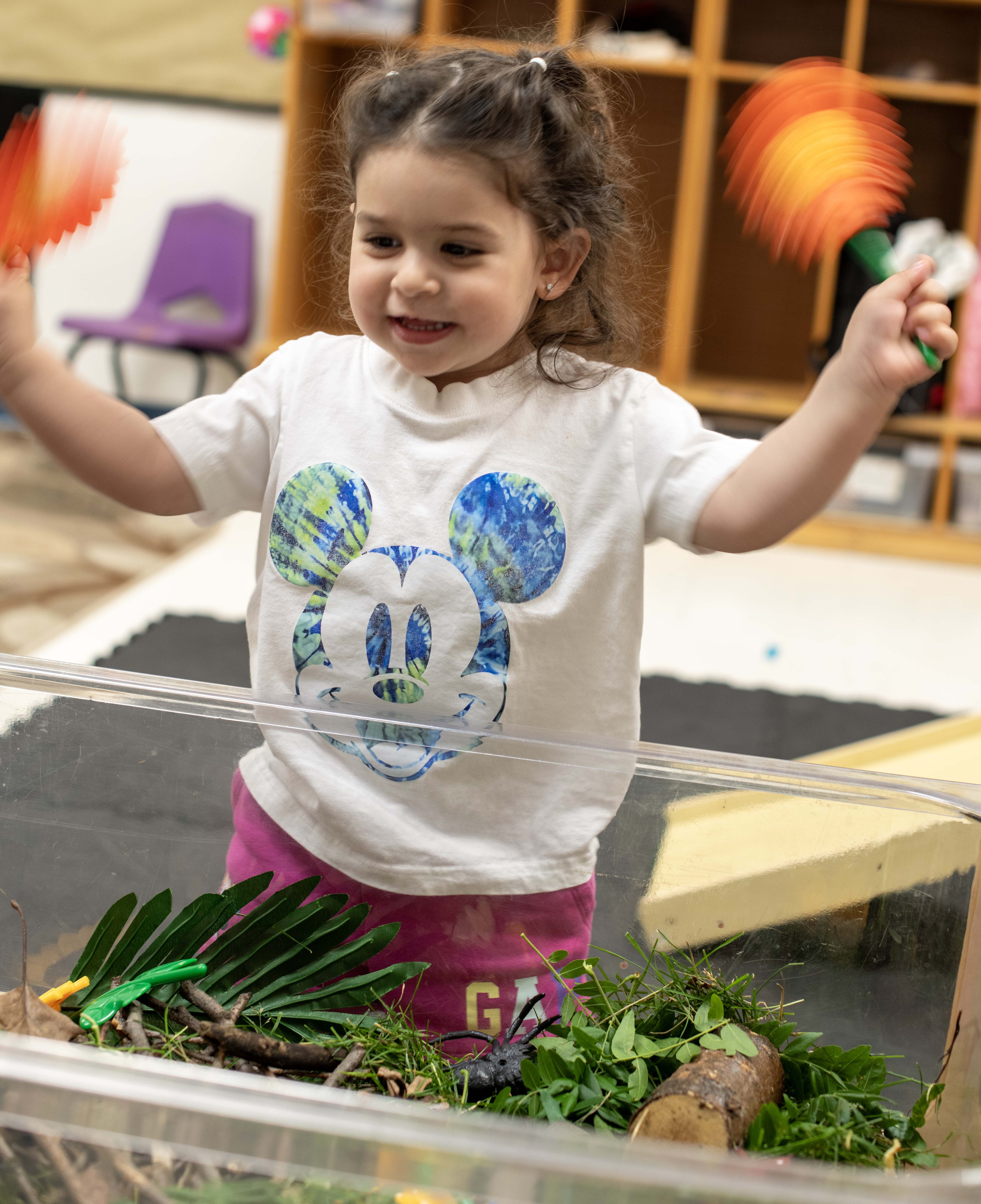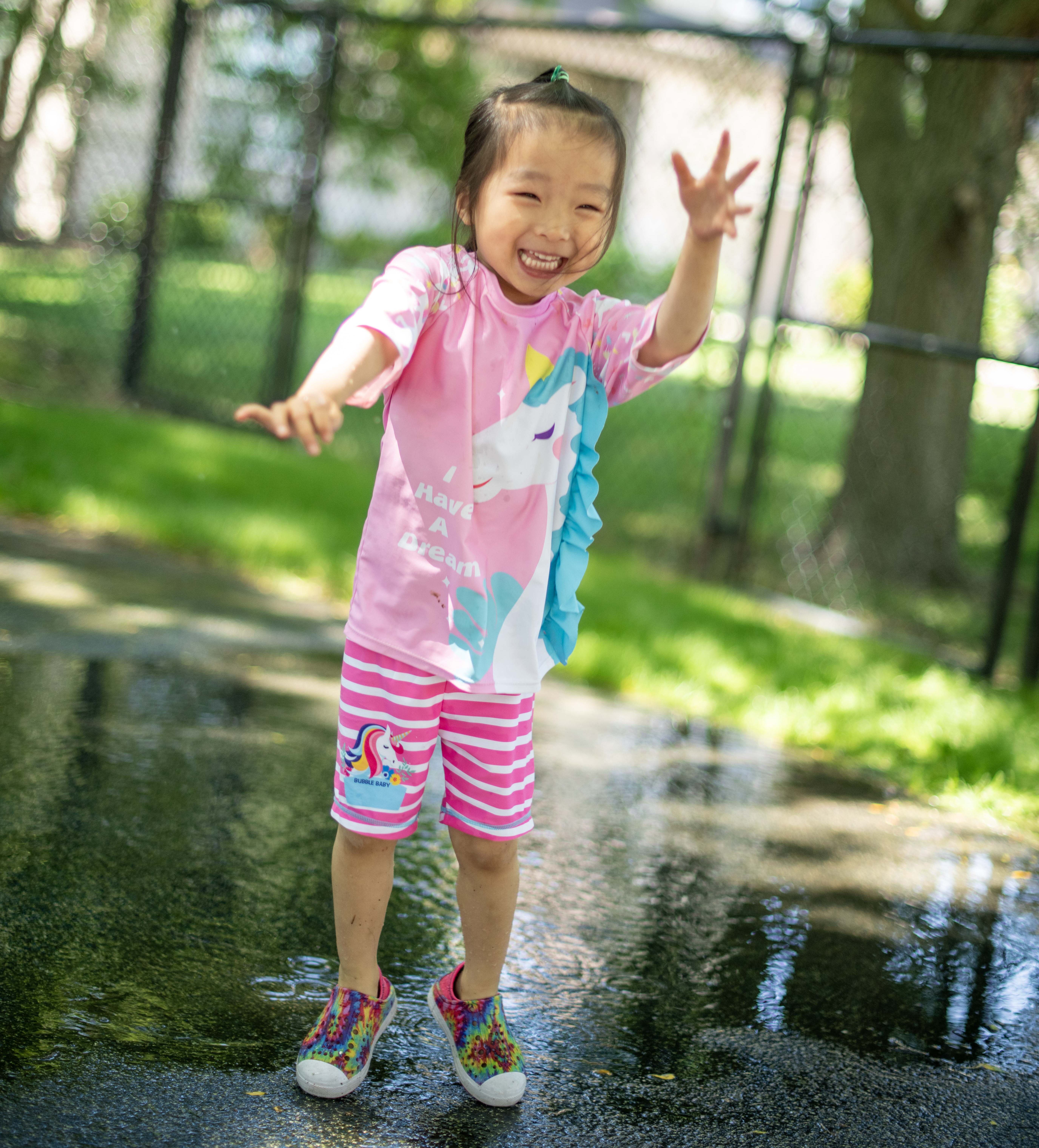 Sunflower campers take advantage of all the amenities available at JCYS Buffalo Grove during the school year, including our toddler gym, dance room, full-sized indoor gym, and securely enclosed outdoor playgrounds with age-appropriate facilities. For extra summer fun, we turn on the rainbow sprinkler outside so campers can splash around to cool off.